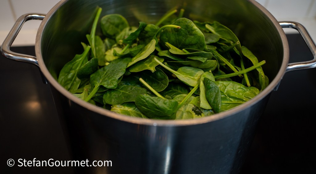 Wash 675 grams of spinach if needed and place it in a pot while it is still wet. If the spinach is already washed, add some water to the pot. Cover the pot and bring to a boil.