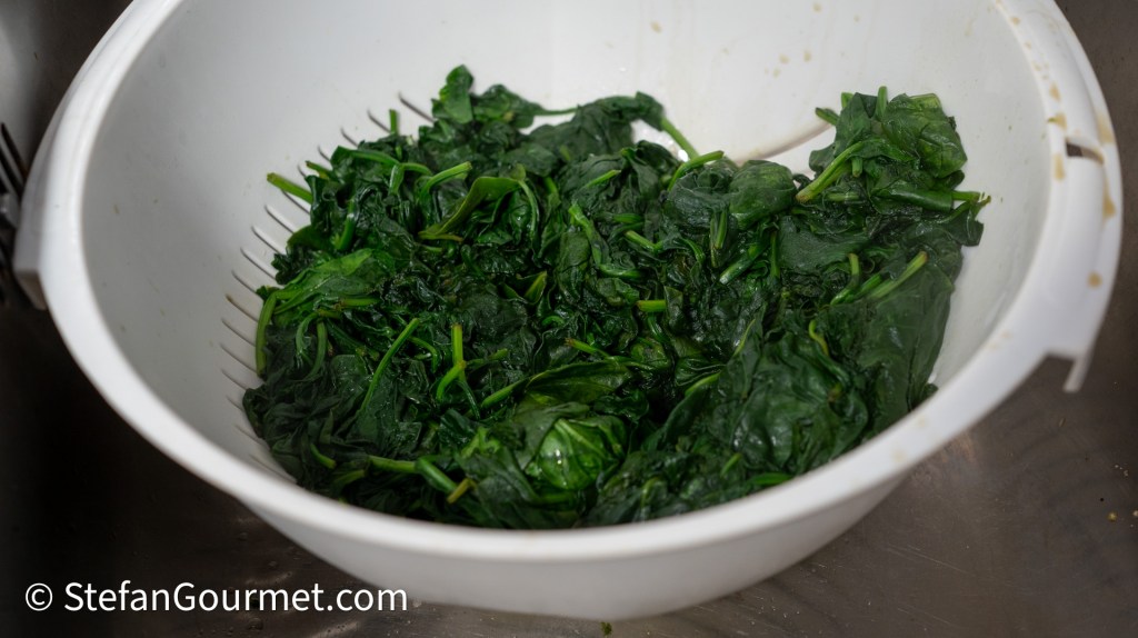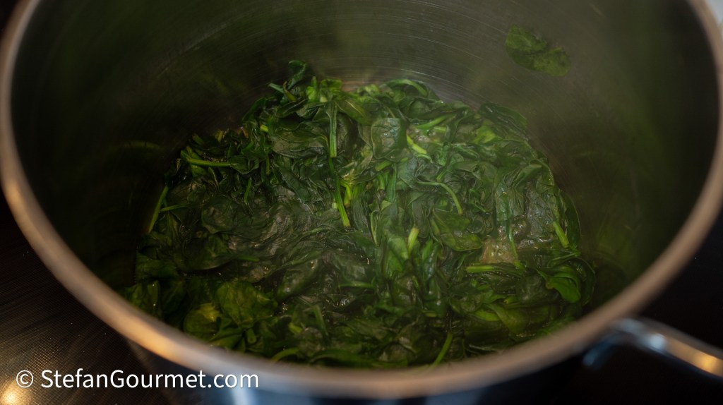 Boil the spinach until it has wilted, stirring one or twice. This will only take a few minutes.