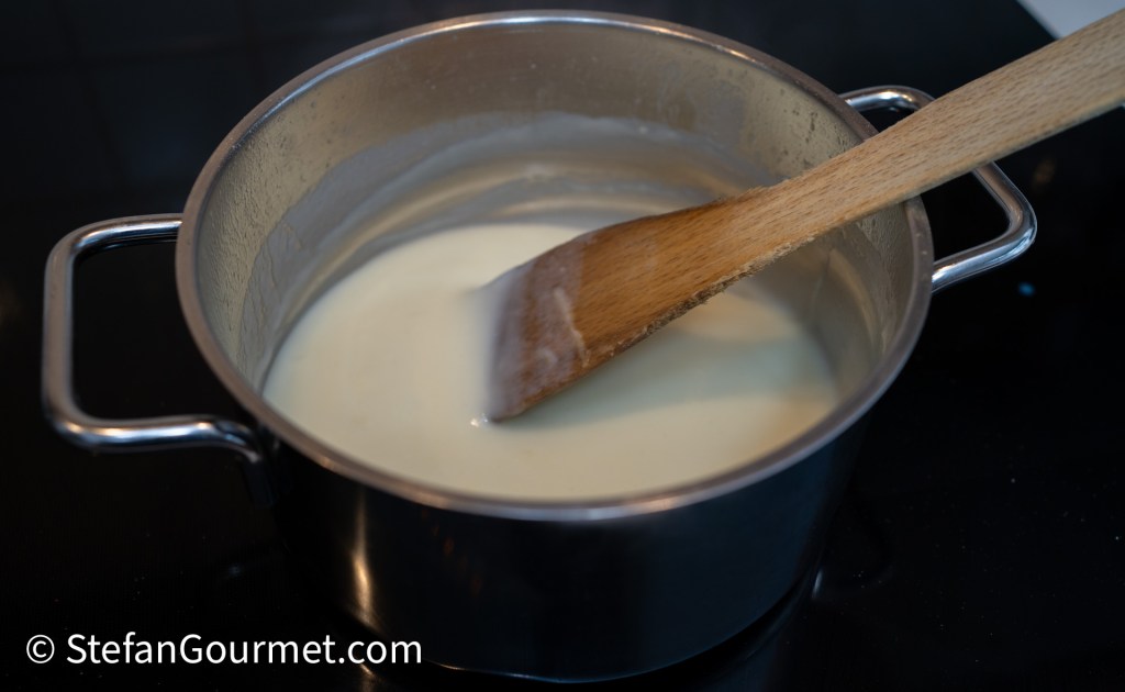 Make a white sauce from 250 ml milk, 25 grams butter, and 25 grams flour, using my instructions.