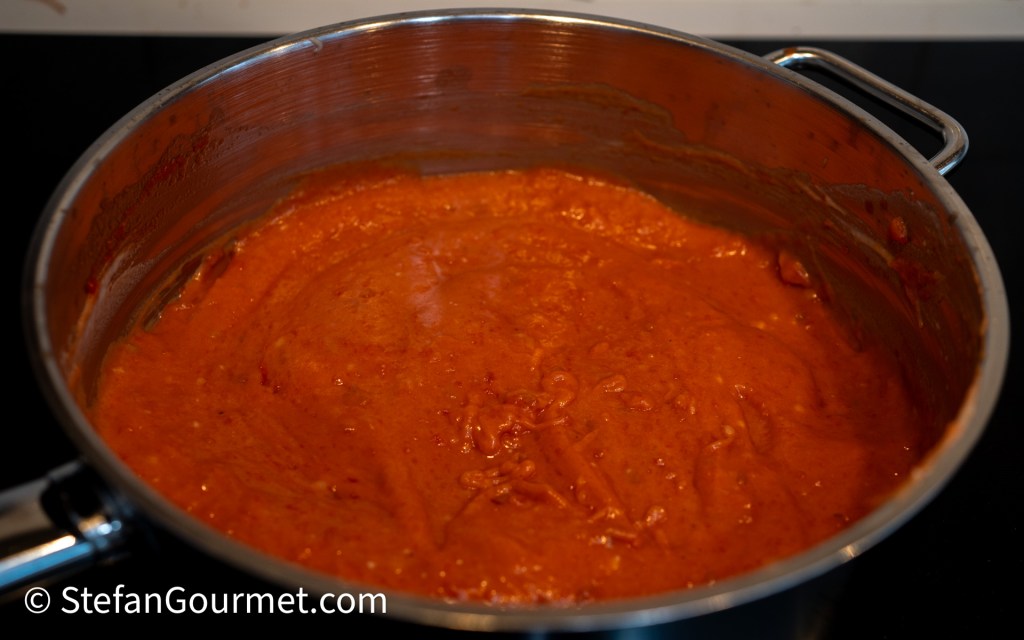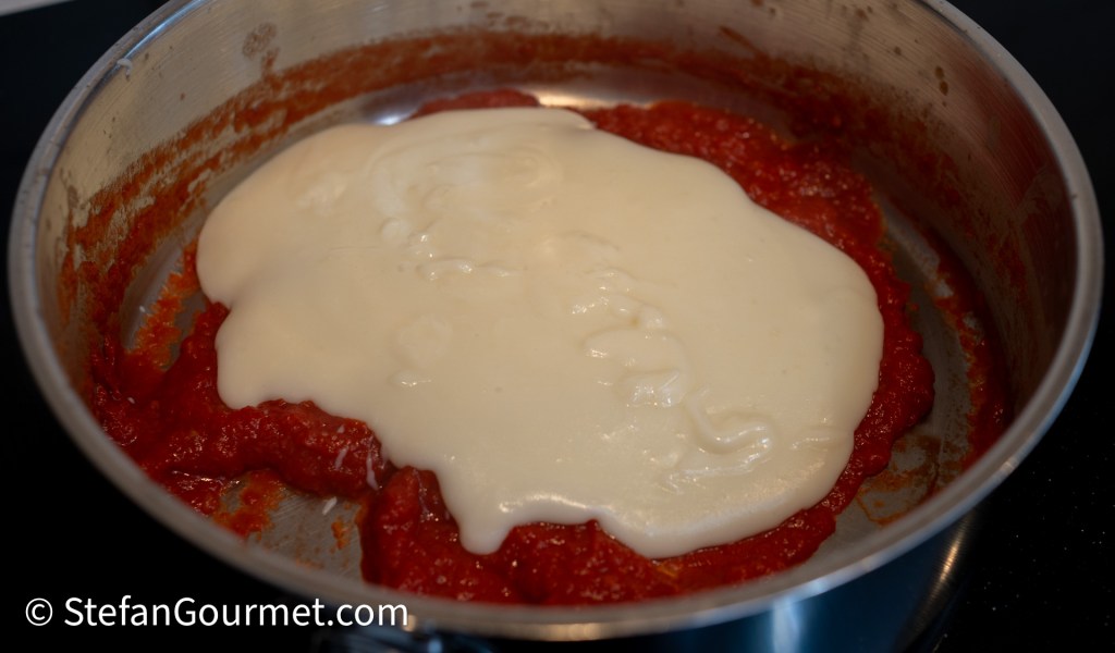 Stir until homogeneous. Season the pink sauce to taste with salt and freshly ground black pepper.