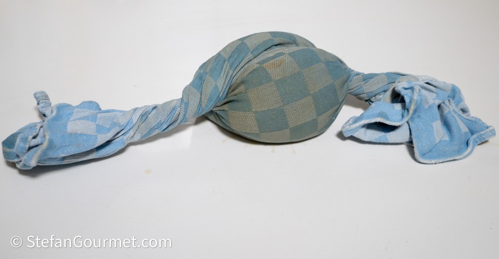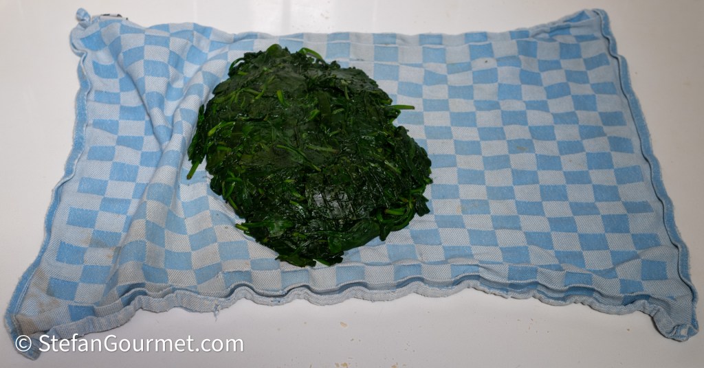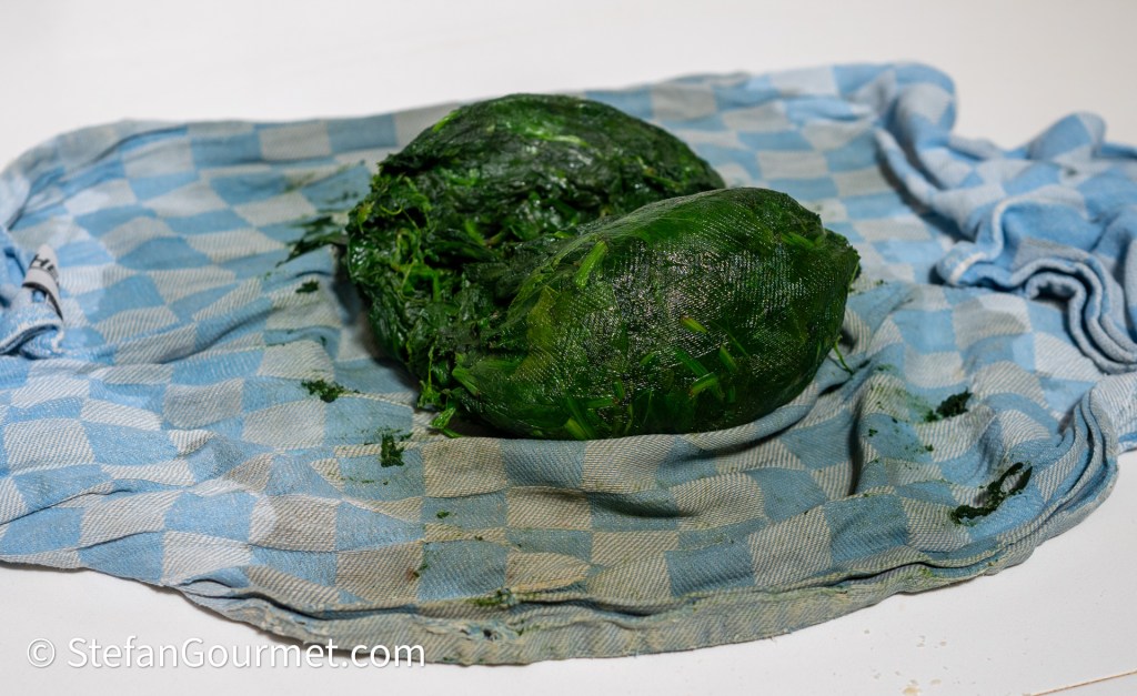 …and wrap the tea towel around it like a piece of candy, twisting in reverse directions on both ends. Keep twisting to squeeze out as much liquid as possible.
