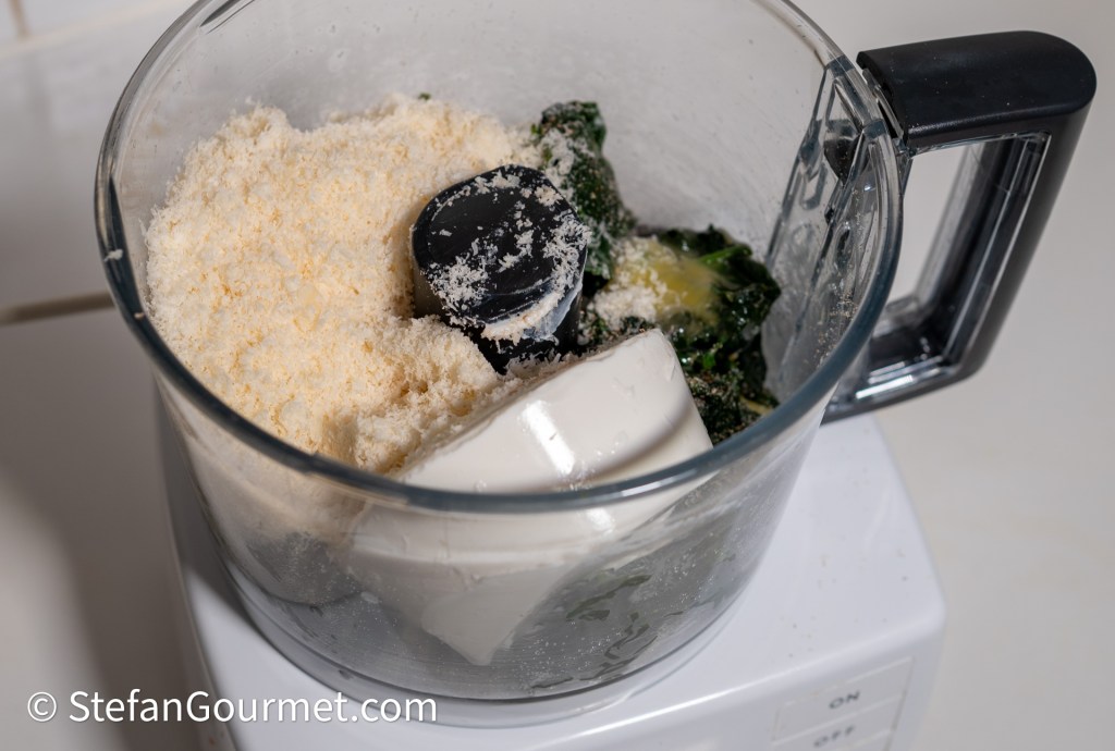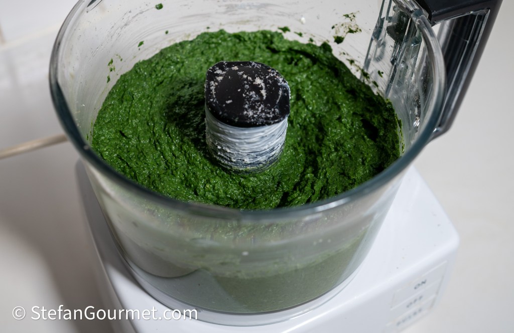 Combine the spinach in the bowl of a food processor together with 250 grams ricotta, 75 grams of freshly grated parmigiano reggiano, 1 egg yolk, salt, freshly ground black pepper, and some freshly grated nutmeg.