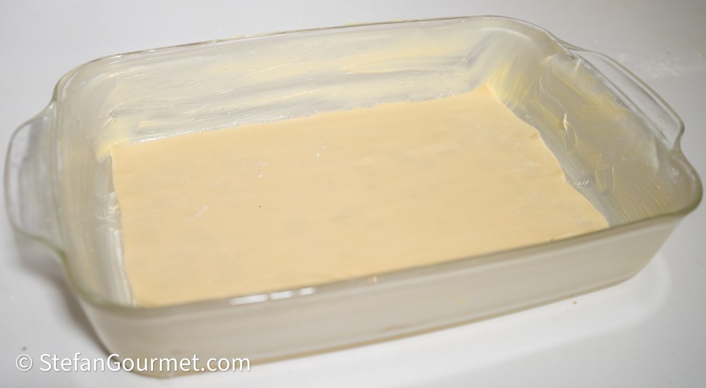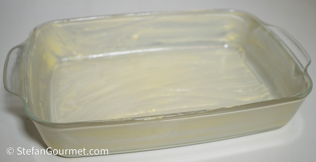 Grease a rectangular 20 x 30 cm (8 x 12 inch) or square 20 x 20 cm (8 x 8 inch) oven proof dish with 12.5 grams of butter.