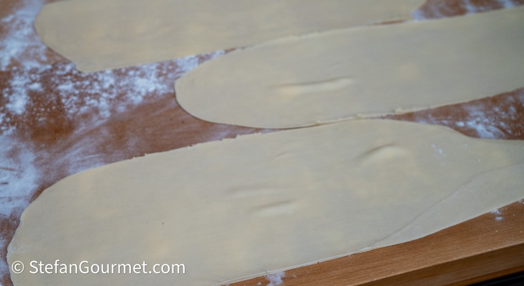 Roll out the pasta dough into thin sheets, and place them on a floured work surface so they don’t get stuck.