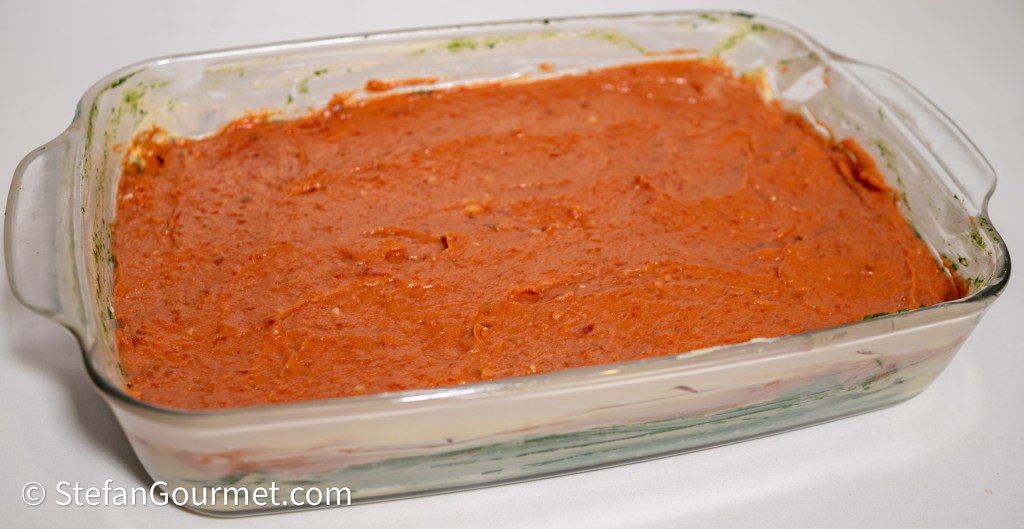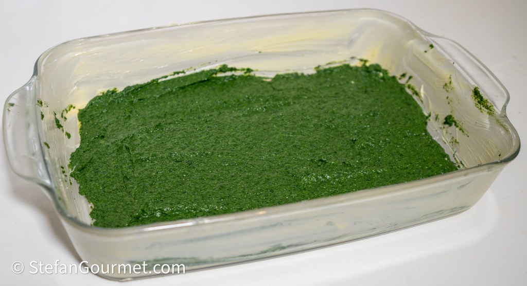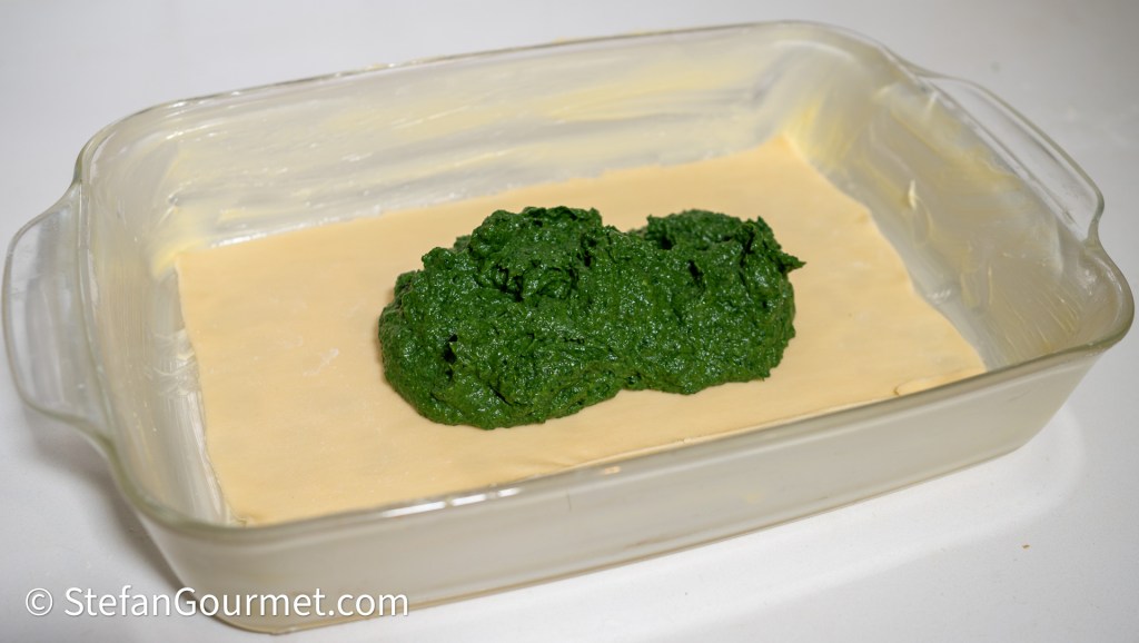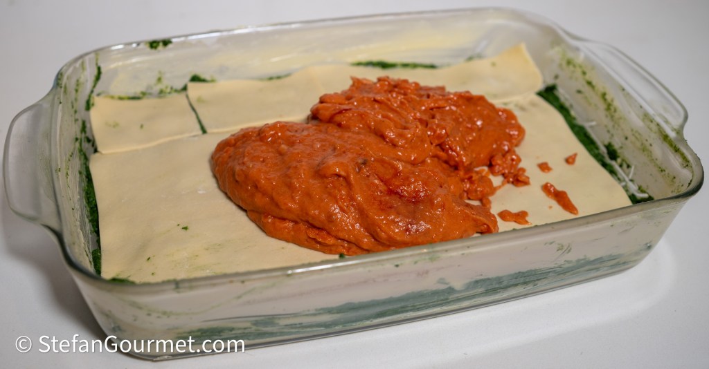 If using a 20 x 20 square dish, use 6 layers of pasta, 4 layers of spinach, and 2 layers of pink sauce: from below this means pasta, 1/4 of the spinach, pasta, 1/4 of the spinach, pasta, 1/2 of the pink sauce, pasta, 1/4 of the spinach, pasta, 1/4 of the spinach, pasta, 1/2 of the pink sauce.