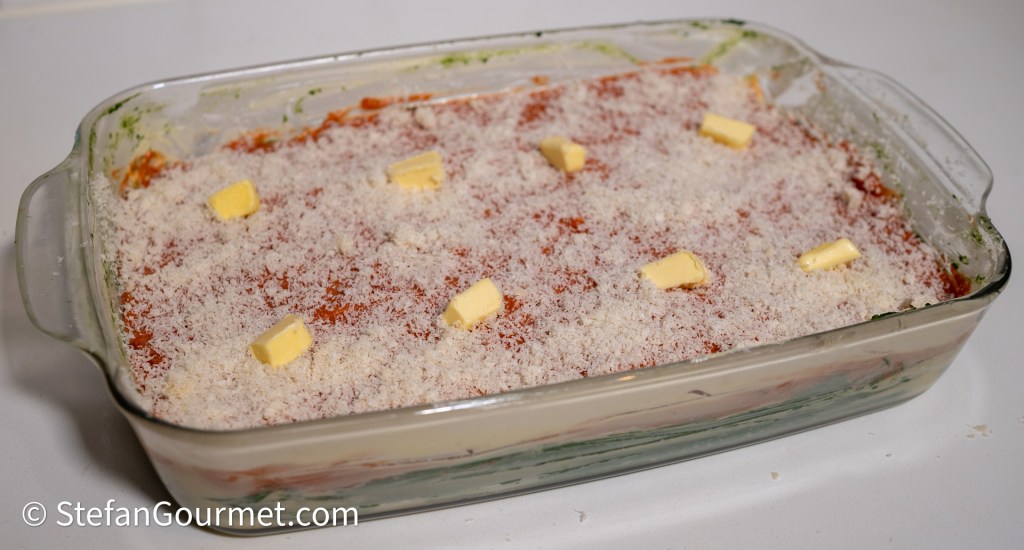 Sprinkle the top evenly with 25 grams (1/3 cup) of freshly grated parmigiano, and dot with the remaining 12.5 grams of butter.