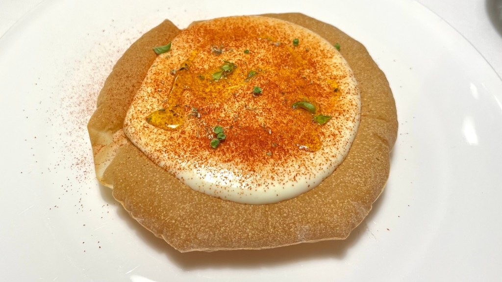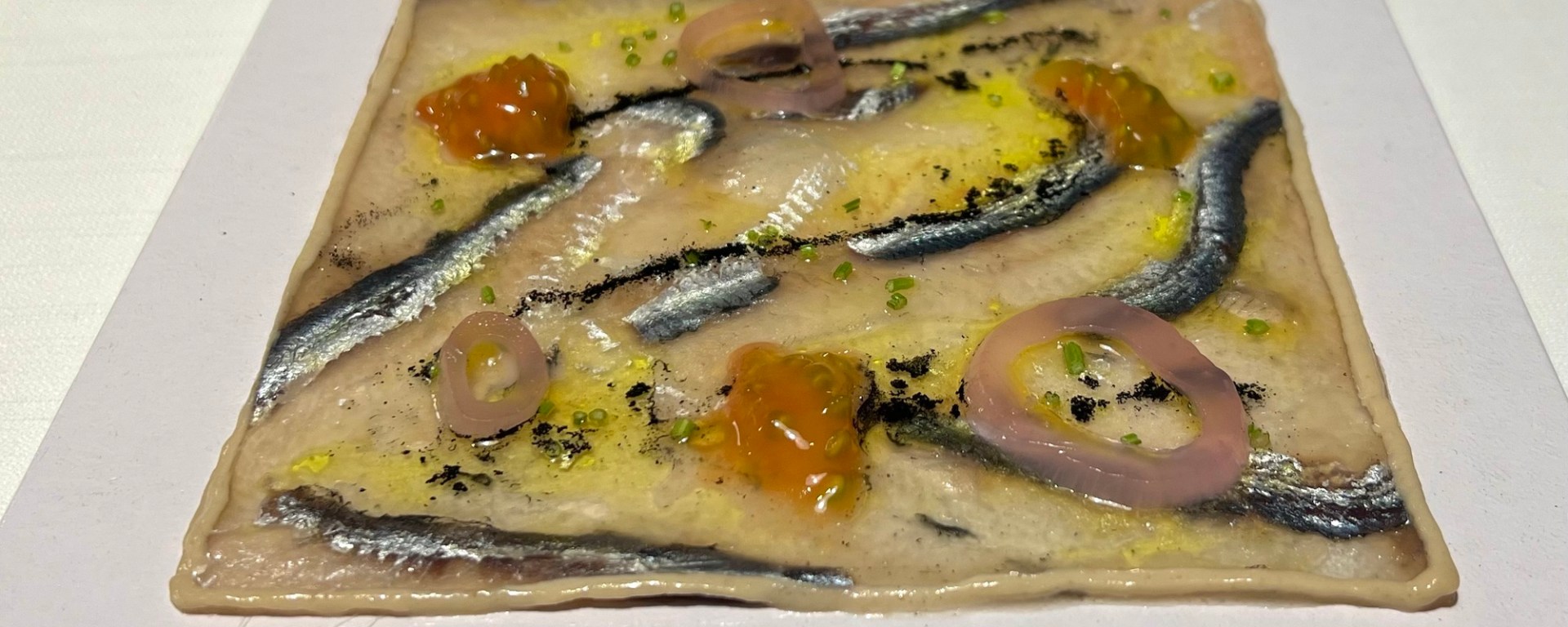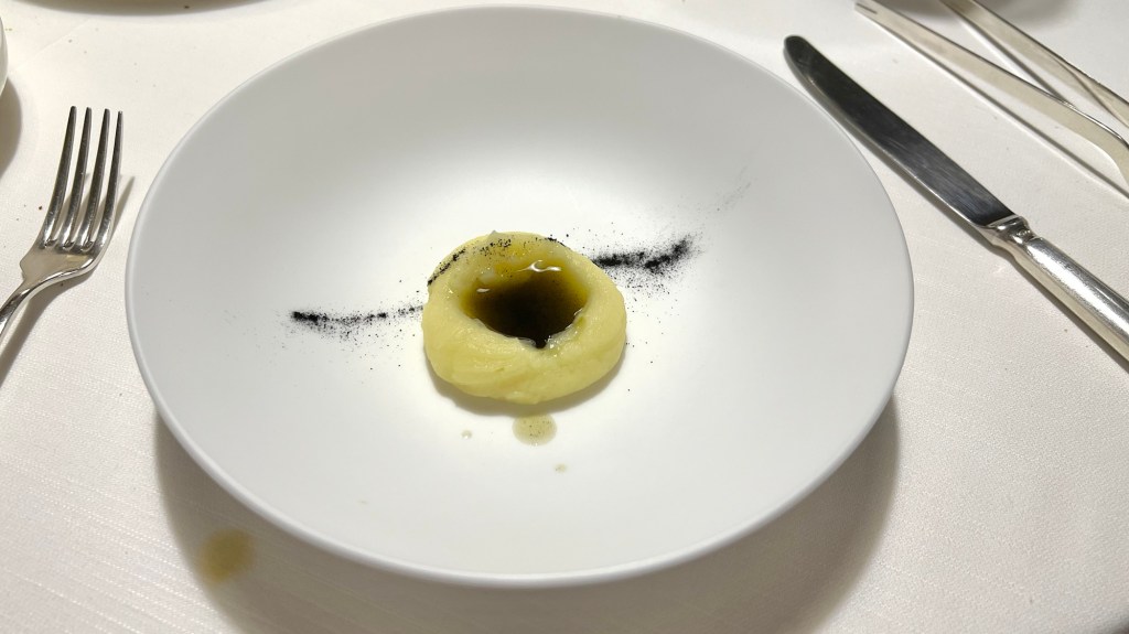 The first antipasto, Pizzaiola, is an evolved version of the same dish as 11 years ago, which looks and tastes like a pizza, but is not. The crust is hollow and only a ring. Inside of it is potato foam instead of mozzarella, with smoked hake (fish), tomato powder, and fresh oregano. Wonderful and delicious.