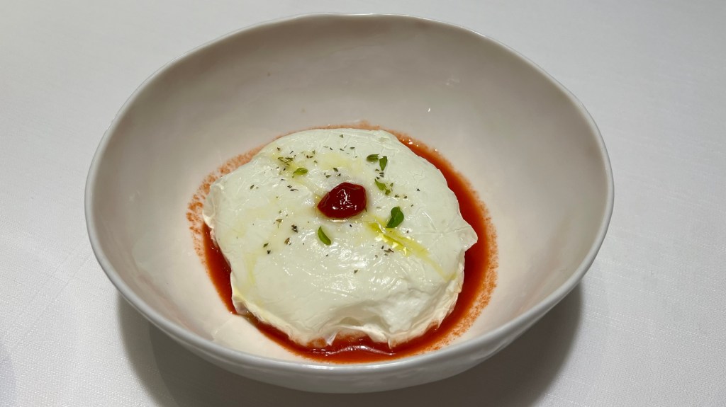 It was not an ideal pairing for the next antipasto, which had also stayed on the menu by popular request. It was a fake buffalo mozzarella, made of a milk skin (the skin that forms on top of milk when you boil it), filled with a mousse of buffalo mozzerella and served with a tomato coulis and extra virgin olive oil. The ‘mozzarella’ is amazingly light and fluffy. The wine was fine with the mozzarella, but struggling a bit with the sweetness of the tomato.