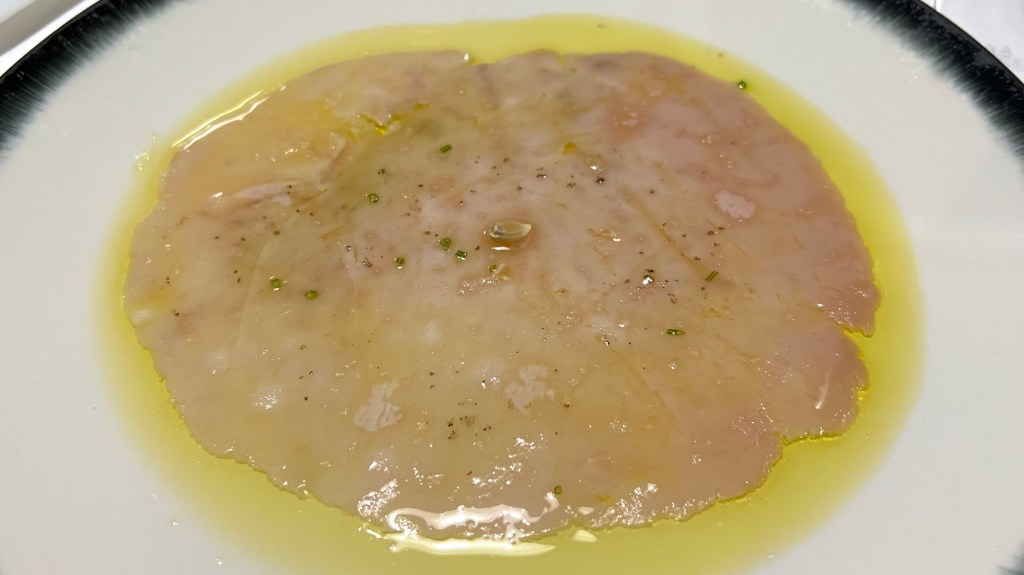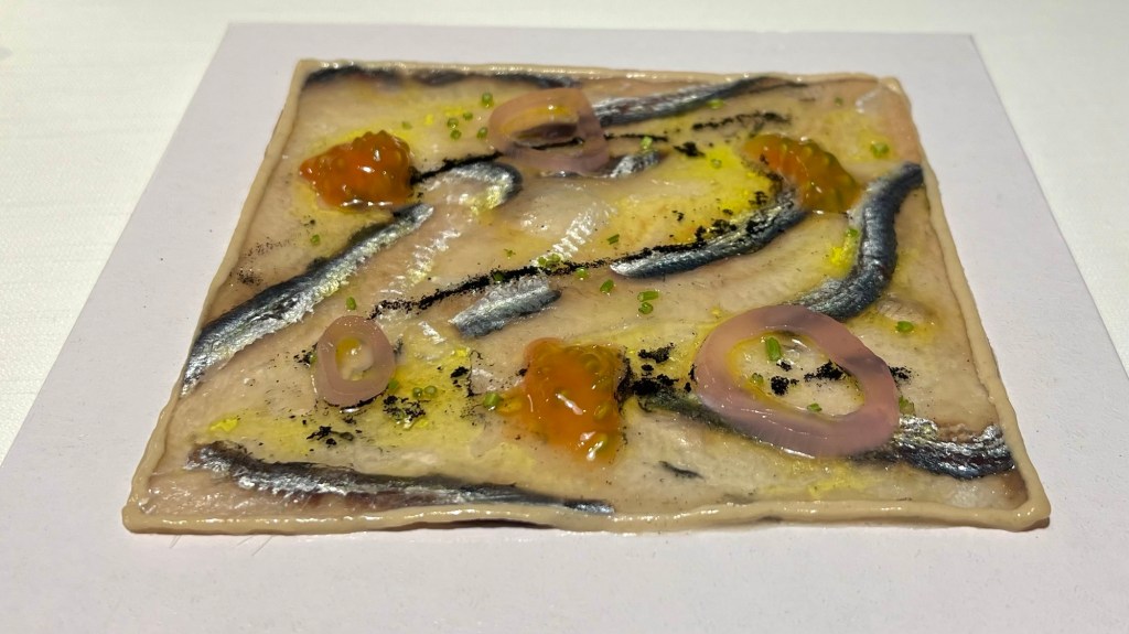 It was an excellent pairing for the “Painting of Anchovies”. Anchovies ‘carpaccio’ with tomato, olive oil, and a ‘frame’ of bottarga. Again wonderful and delicious.