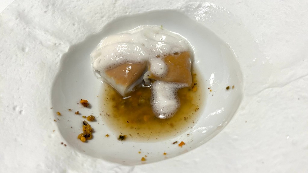 Underneath was something that looked like, and tasted like (in a good way), sea water with sand, and delicate tender ‘rocks’ of sea urchin (uni) with squid (calamari). When I first saw the dish I thought there were going to be strips of squid underneath the foam, but it was actually just foam (and I do not have a clue how they made it look that way in the kitchen).
