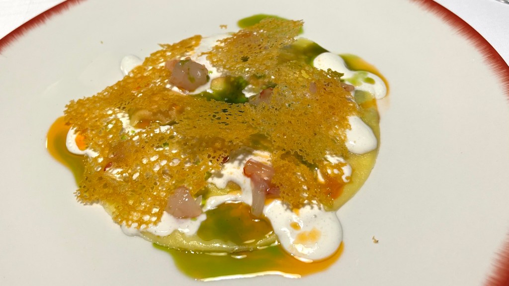 The waiter told us we had actually skipped a remodelling of the restaurant. Next to à la carte there are three tasting menus to choose from: I’Ilusione (7 courses for 150 euros), Il mare inaspettato (8 courses for 170 euros), and Scala dei Turchi (9 courses for 190 euros). We opted for the latter, with wine pairing (6 wines for 100 euros).