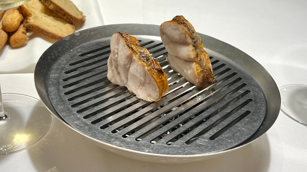 …served with mashed potatoes. Tweezers were provided so you could move the fish to the dish yourself, as a change from the waiter doing this as is usual in Michelin starred restaurants. This was easily the least interesting dish of the meal. The mashed potatoes were delicious, but just mashed potatoes, and the grouper was very firm.