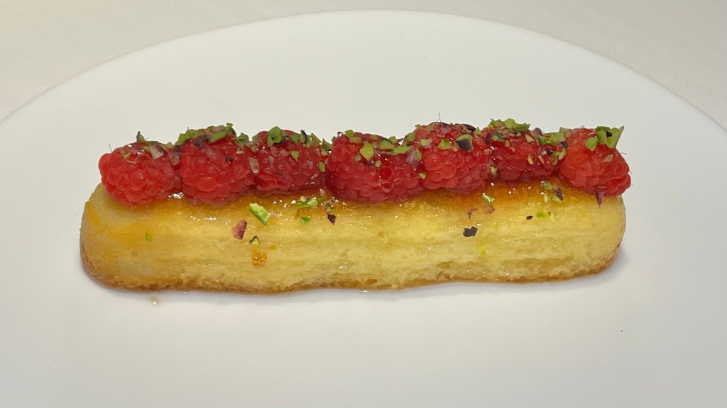 I picked the “baba au rhum” from the four desserts to choose from. The baba was stuffed with a vanilla cream and topped with raspberries and pistachios. The dessert was very nice, but a bit too sweet for the wine.