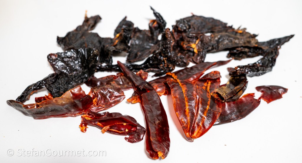 The chorizo we know here in Europe is Spanish chorizo, which is a dry cured pork sausage with smoked paprika as the dominant spice. Mexican chorizo is different because it is wet (or fresh, only lightly cured) rather than dry, and because the dominant spice is from a variety of dried chiles. Spanish chorizo is easy to find at any supermarket, but if you want to have fresh Mexican chorizo, the only way is to make it yourself. I used the recipe from Mexico in My Kitchen and followed it with some minor changes. I used ground pork belly instead of a mixture of ground pork and ground fat, just because it was easier. I just garlic powder instead of fresh garlic, because it is easier to use and less likely to cause spoilage, and only Mexican oregano instead of a very small proportion of dried marjoram. And finally I did not cure the chorizo hanging at room temperature, but lying down on plates in the refrigerator instead. There are regional variations for chorizo in Mexico, but Mely Martinez does not specify from which region of Mexico her recipe hails. For the best flavor, do not use chile powder and ground spices, but whole dried chiles, and grind all the spices freshly.