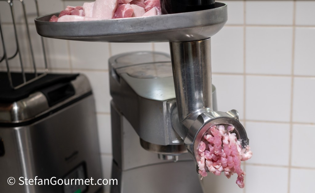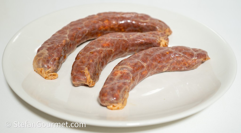 Use the sausage stuffing attachment of your meat grinder to stuff the sausage meat into casings. This was the first and only time I’ve done this, so you are better off with googling how to do this than by me describing what I did. I’d say it is not difficult as long as you are not concerned that all sausages should have exactly the same size and should be completely without trapped air.