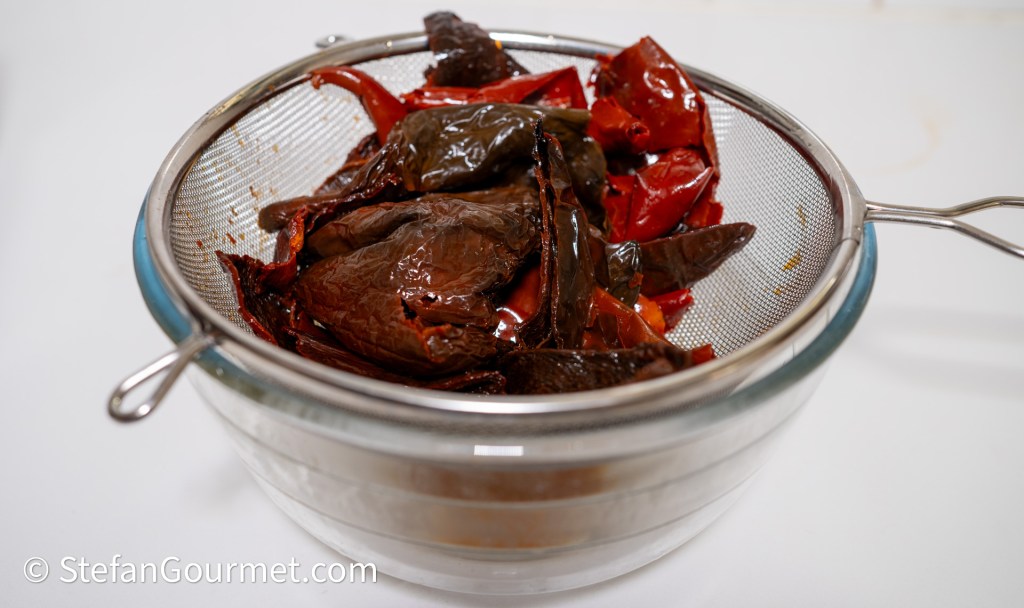 Place the chiles in a large bowl, cover with hot water, put a plate on top to keep the chiles submerged, and allow the chiles to soak for 30 minutes.