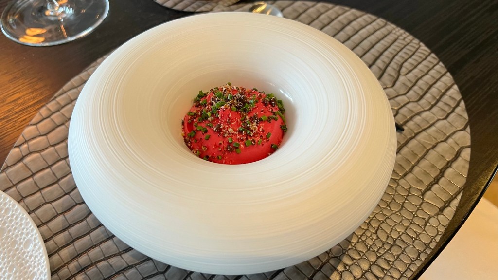 It was a good pairing for the final appetizer of Dutch salted herring with beetroot. Salted herring can have a very pronounced flavor, but here that was balanced out by the sweet beetroot.