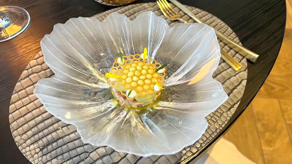 The first course of the tasting menu looked great. It was raw tuna with cucumber, tiger milk, peanuts, and tandoori spices. A very nice combination of flavors and an excellent pairing with the Xarel-lo.