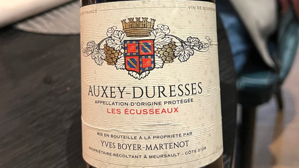 We did have a red Burgundy with the cheese, a 2019 Auxey-Duresses les Écusseaux by Boyer-Martenot. Velvety tannins and some nice cherry aromas.