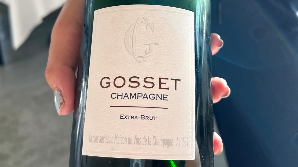 We started with a nice glass of Extra Brut Champagne (23% Pinot Meunier, 32% Chardonnay, 45% Pinot Noir) from one of the oldest houses in Champagne.
