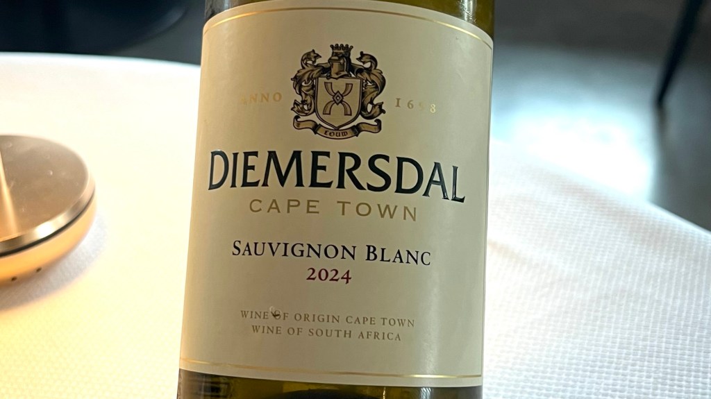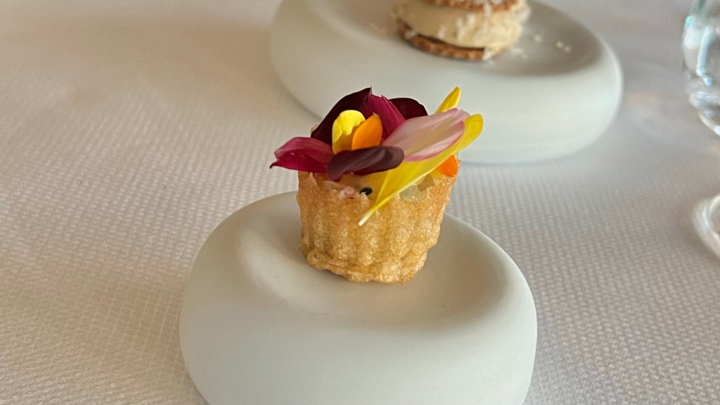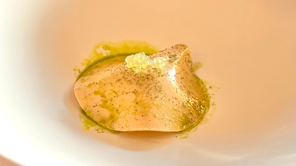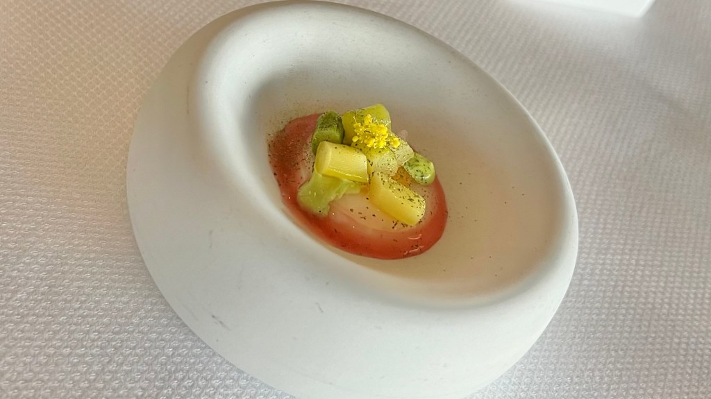 It took quite a while for the first amuse bouche to arrive (40 minutes after we were seated), so they were served with the first wine of the pairing rather than with the champagne. The first wine was a 2024 Sauvignon Blanc from Cape Town, South Africa. Because it is from the Southern Hemisphere, 2024 is already the current vintage. The wine was fruity, aromatic and full-bodied, with relatively low acidity for a Sauvignon Blanc.