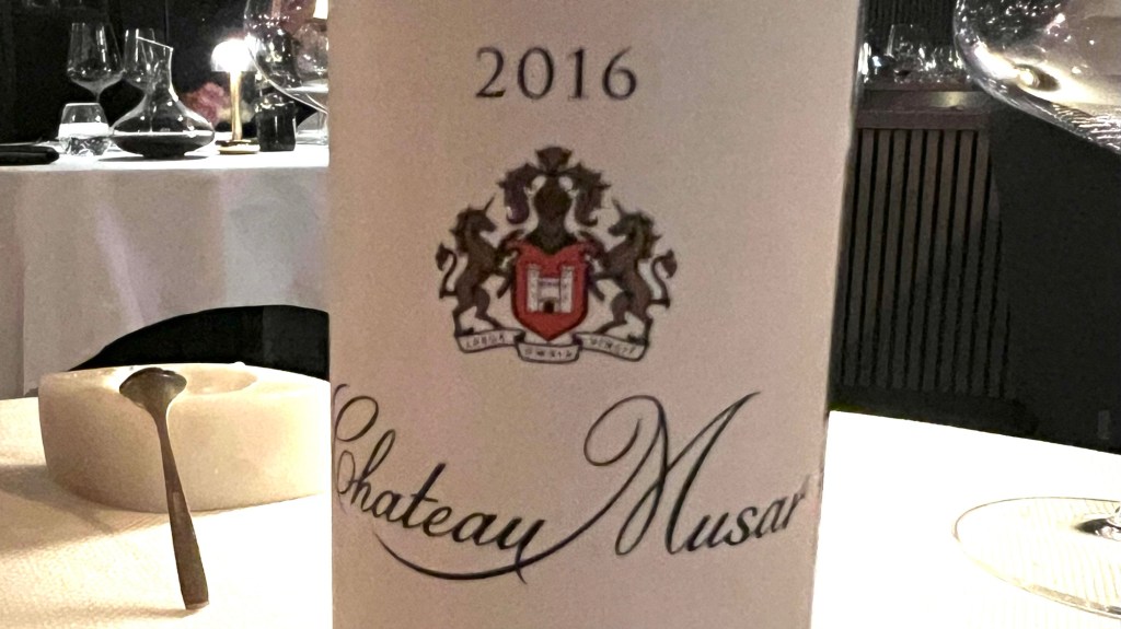 The sommelier suggested a half bottle of 2016 Chateau Musar from the Bekaa Valley in Lebanon, a blend of Cabernet Sauvignon, Cinsault, and Carignan that has been aged in oak for 12 months. Very nice dark fruit (blackberry) and elegant acidity and tannins.
