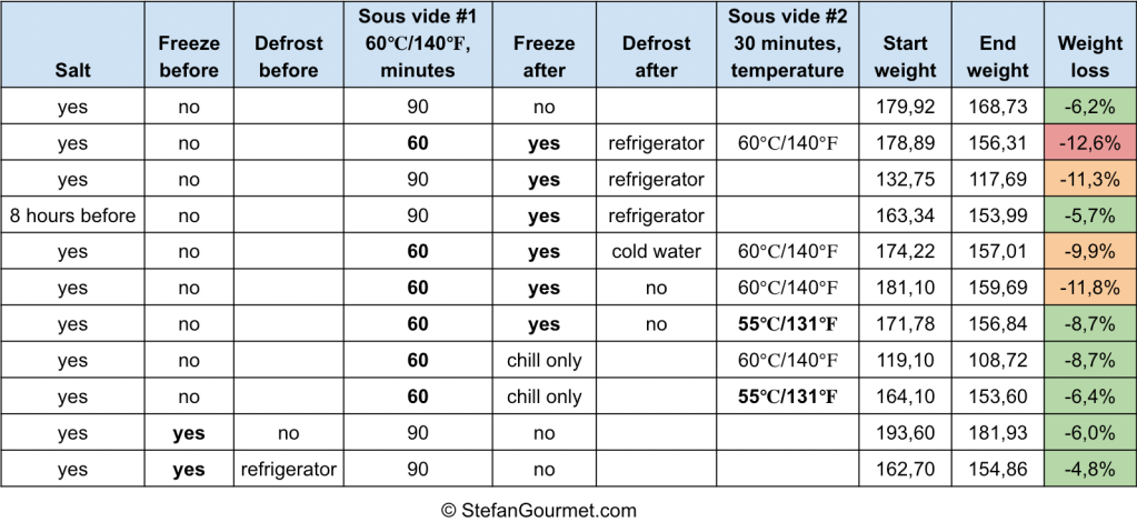 I am not saying these were scientific experiments. The pieces of meat used for the experiments were not exactly the same. For example, they my differ in size or shape, or they could contain a sinew that would contract the meat when it is heated, and thus squeeze out more liquid. The the way I salted them was also not exactly the same. I did weigh the salt, but the distribution could be slightly different and some salt could be left on the cutting board from salting the other side. So when I repeated the experiments, the results I got were a few percentage points apart because of such factors, as you can see in the table above. The different rows for the same type of meat and time/temperature indicate that I did multiple batches with the same parameters to see how consistent the results were. I am a home cook and I don’t want to throw away food, so we were eating all of the experiments and that limited the amount of experiment I could do. And so although I did dozens of experiments, that was not enough to average out those random factors. The conclusion that meat that is salted before sous vide retains more juices was confirmed by all of the experiments. But the results for different times were not consistent enough to draw any firm conclusions. It does seem though that for a short sous vide cooking time, it is more important to rest the meat between salting and sous vide cooking, then for a long sous vide cooking time. Although for a char siu marinade pork, allowing it to marinate first did make a difference in this experiment.