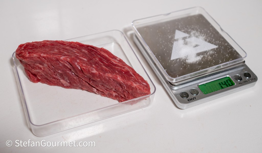 So how much salt should you put on the meat before vacuum sealing it? This is of course a matter of personal preference. I like to use about 1% salt of the weight of the meat. To make the meat more juicy and enhance its flavor even more, you could add more salt, and then add some sugar as well. The sugar will mask the salted flavor, so the meat will not taste as salty. A typical amount would be about 40% of the amount of salt. Personally I don’t like to do this. The flavor will be stronger, but less typical. Everything will start tasting the same if you use too much salt and sugar. If you use more than 2% of salt by weight, you will cure the meat and it will start to taste like ham. So I mostly stick with 1% salt.