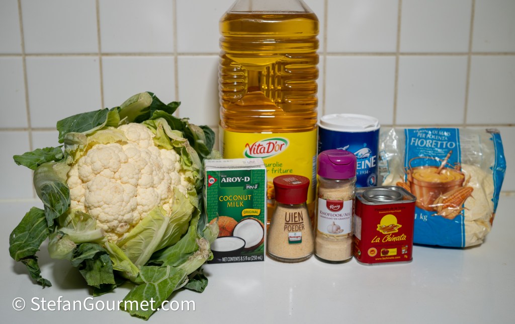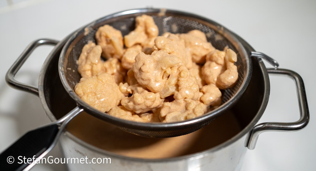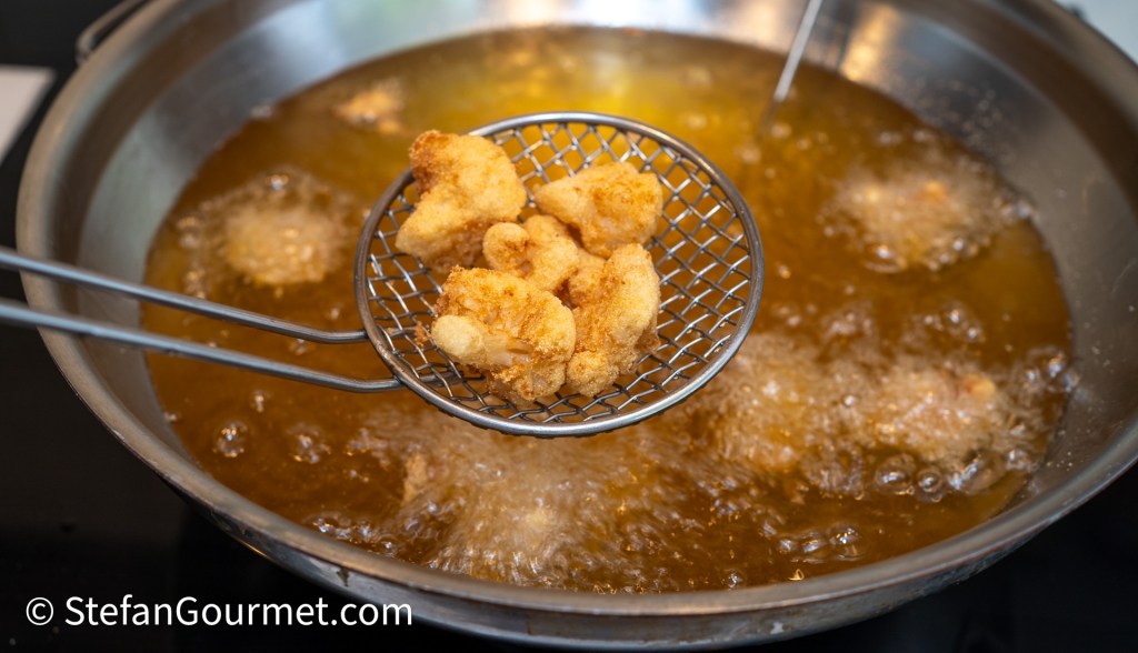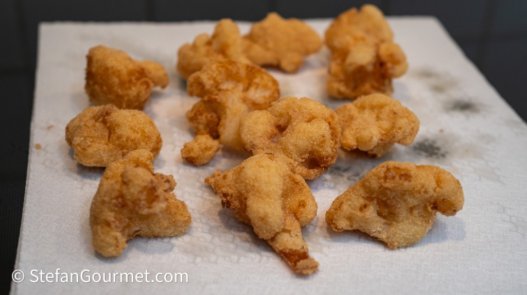 Deep fry at 180C/350F until golden brown. Allow the cauliflower pieces to glide into the hot oil one by one rather than all at once to prevent them from sticking together and to avoid cooling off the oil by too much. As always with deep frying: do not fry too much at once, so the oil can maintain its temperature.