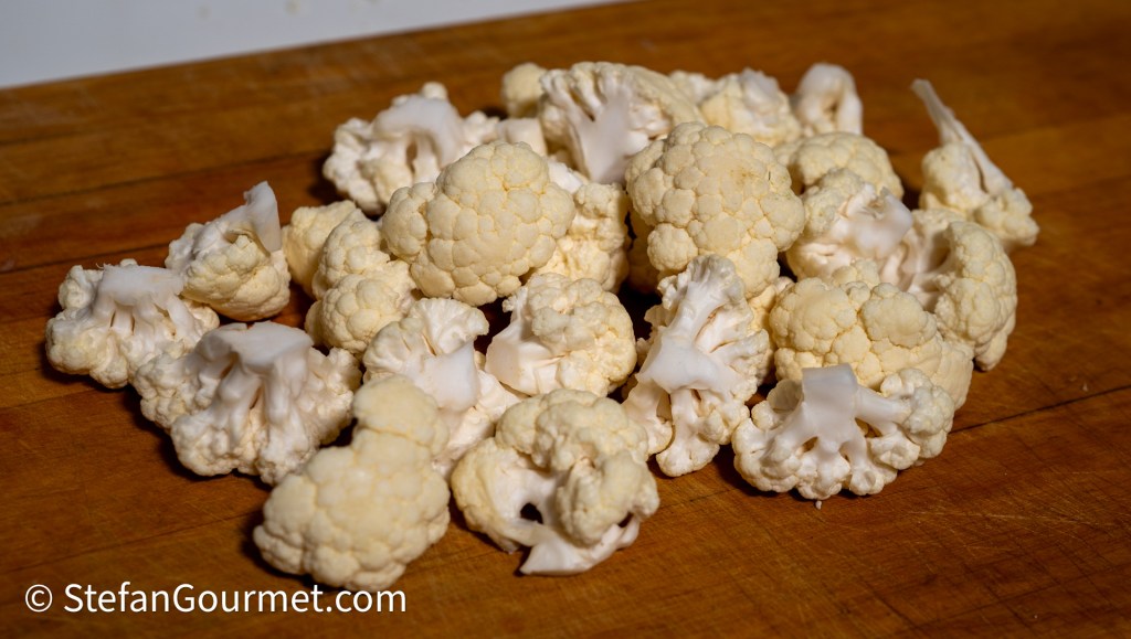 During the wine tour of Australia last year we had lunch at the Nick O’Leary winery in the Canberra district. Both the wines and the restaurant are recommended. One dish we all liked very much was deep fried cauliflower. We liked it so much that someone from our group asked for the recipe. They didn’t provide exact proportions, but with some experimenting here is my version. The combination of cauliflower with smoked paprika and coconut milk works very well. At O’Leary this was served with garnishes of pomegranate seeds, smoked chilli salt, guindilla peppers, and raw fennel marinated in rice vinegar, fish sauce, mirin, and sugar, but I’ve kept it simple to make it easier to pair with wine. Instead of blanching the cauliflower and marinating afterwards, I decided to cook the cauliflower sous vide with the marinade. This preserves the texture and flavor of the cauliflower.