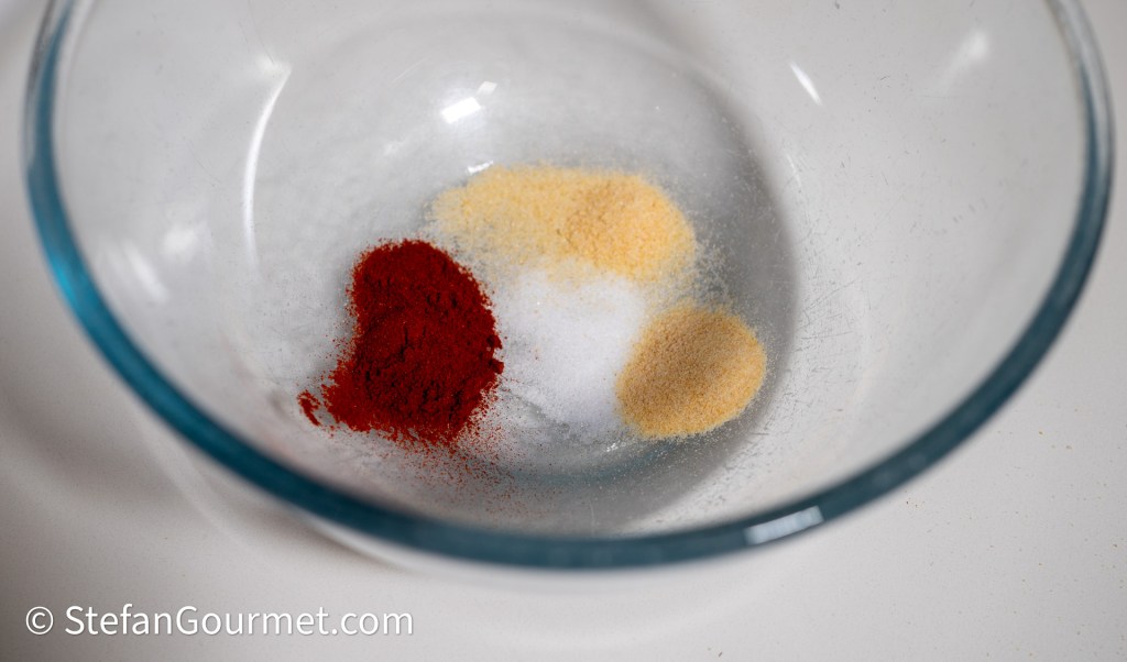 Combine 1 tsp salt, 1 tsp sweet smoked paprika, 1/4 tsp spicy smoked paprika, 1/2 tsp garlic powder, and 1/2 tsp onion powder in a large bowl.