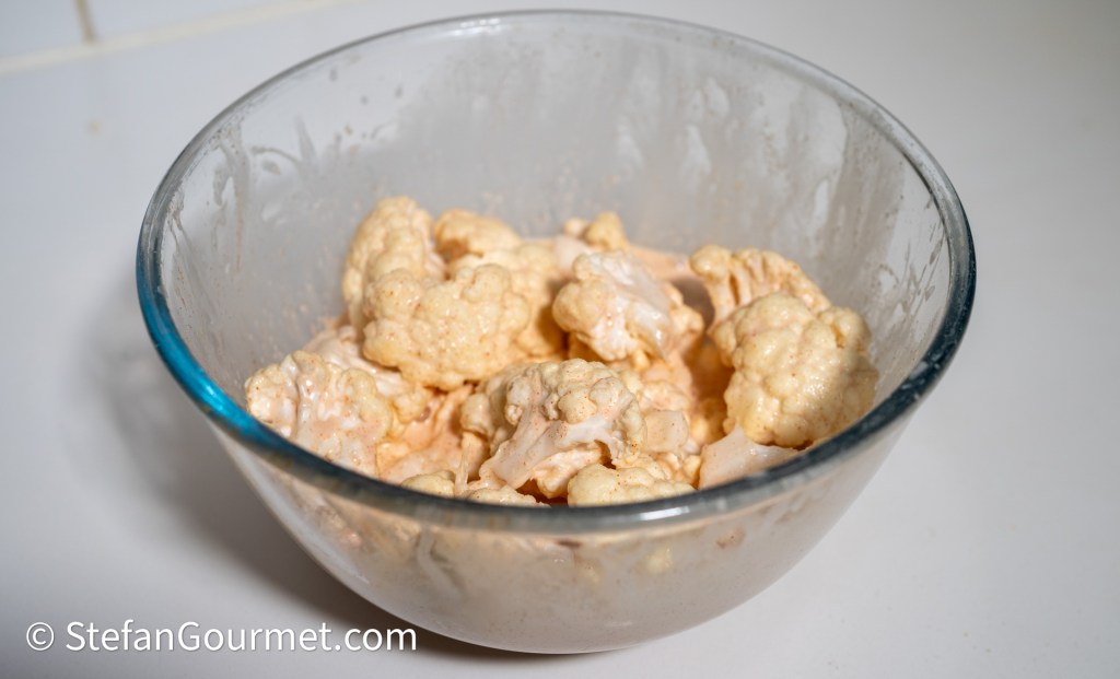 Add the cauliflower florets and toss until the cauliflower is completed coated with the marinade.