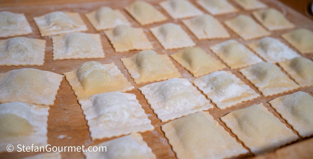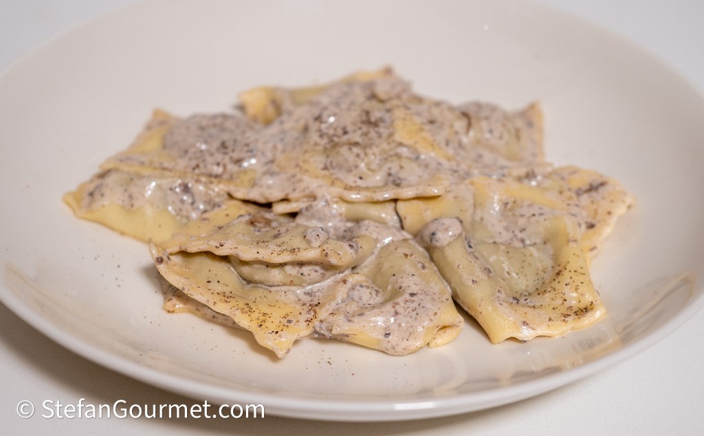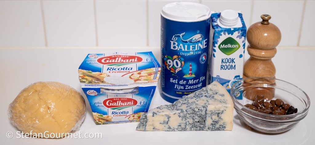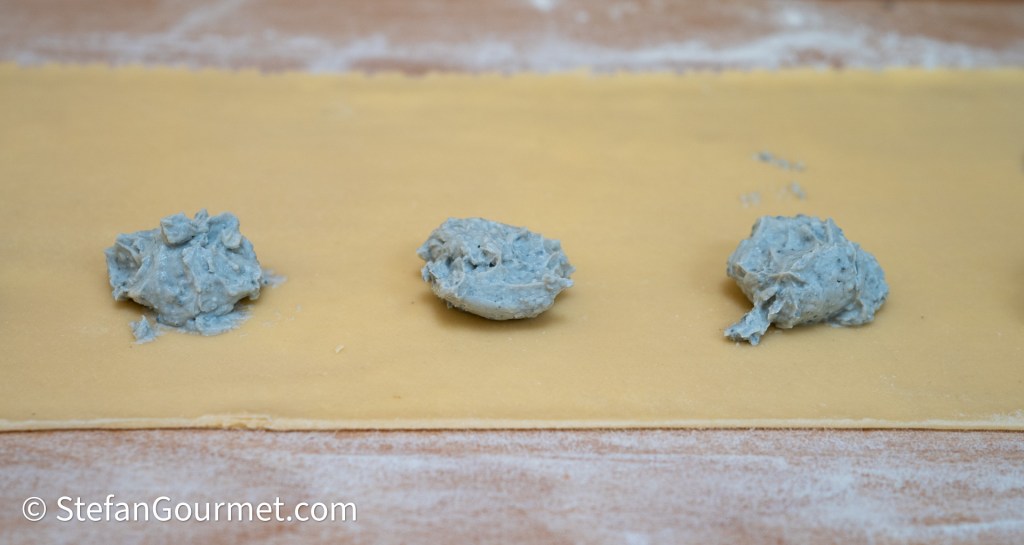 Pasta alle Cenere literally means “pasta with ashes”. This name does not refer to the flavor, but to the appearance of the dish. It is pasta with a sauce of gorgonzola (Italian blue cheese), black olives, and cream. Freshly ground black pepper is added on top to make it look even more like ashes. As I love to make ravioli, I thought it would be nice to make ravioli alle cenere. The ravioli are stuffed with gorgonzola mixed with ricotta, and served with a sauce of cream and olives. The regular recipe uses gorgonzola dolce (mild gorgonzola), but as I was mixing it with ricotta, I used gorgonzola piccante. For a richer version you could also use gorgonzola mixed with mascarpone, also known as magor or gormas.