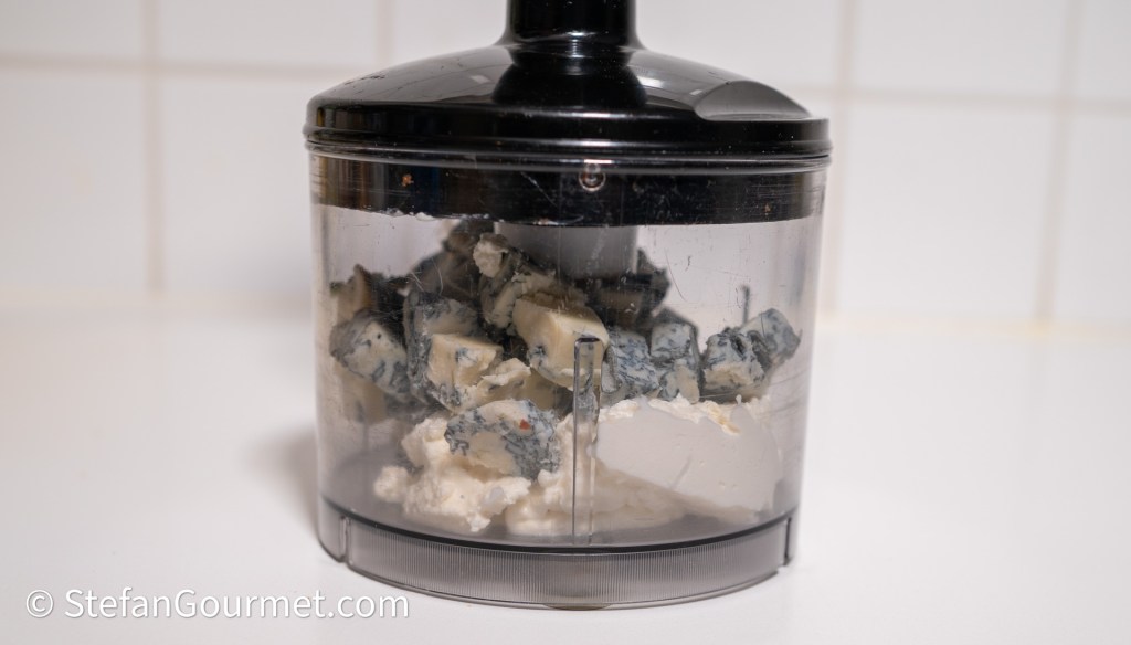 In the meantime, combine 120 grams of diced gorgonzola with 120 grams of ricotta cheese…