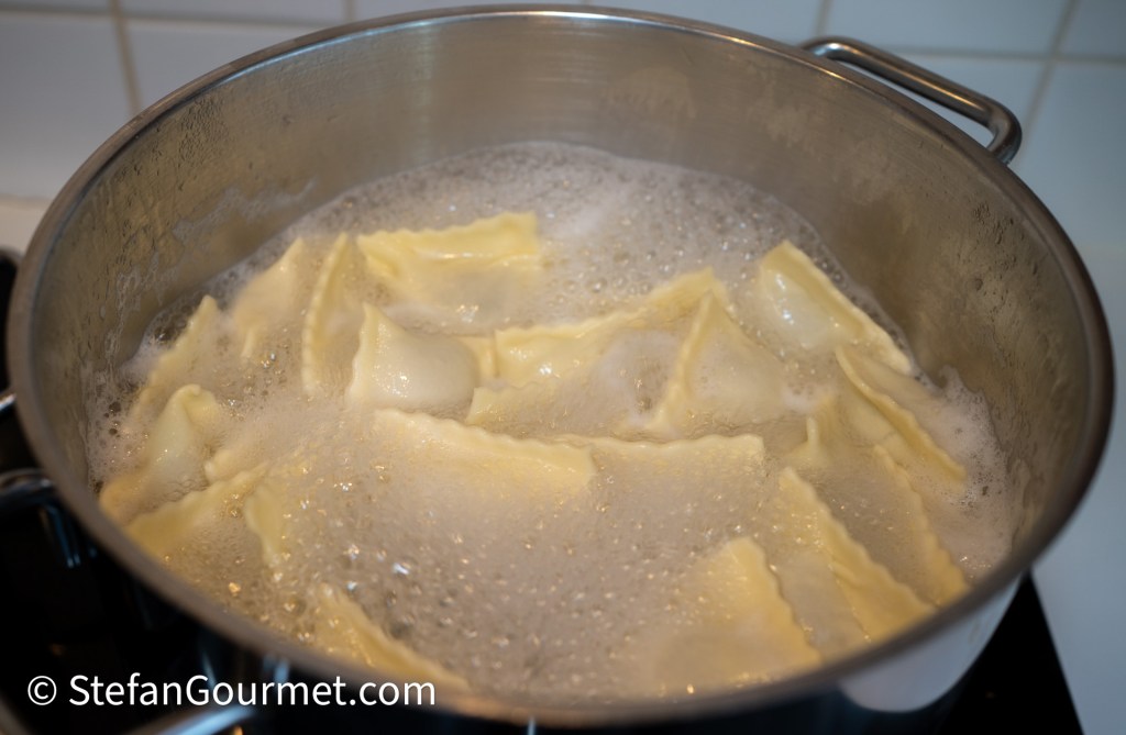 Bring a large pot of salted water to a boil. When the water boils, add the ravioli, and cook them for 2 minutes only.