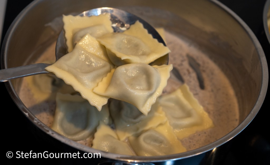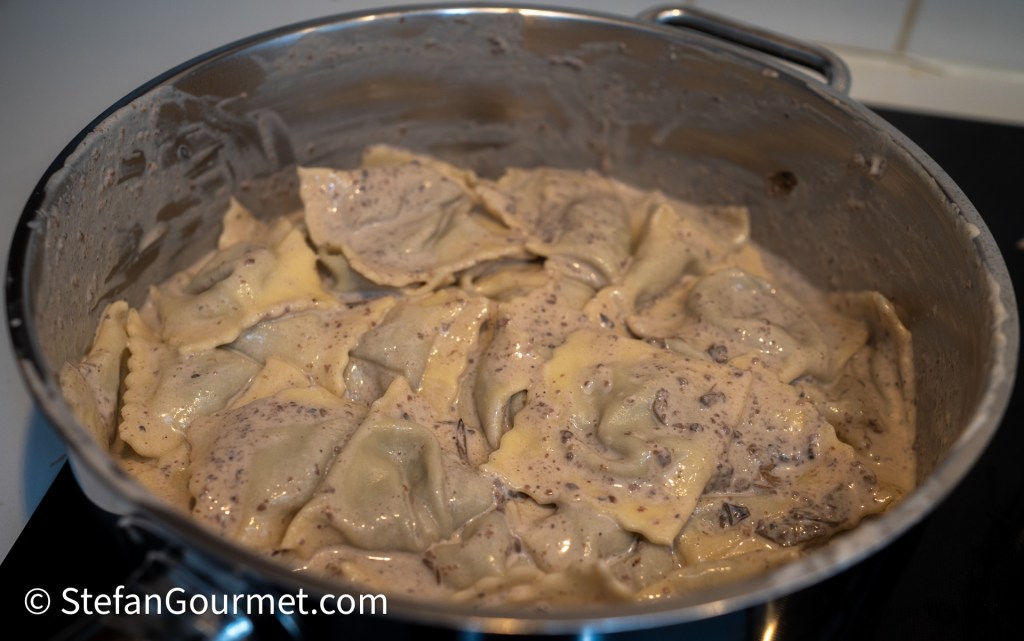 When you have added all of the ravioli, toss them gently to cover them all over with the sauce.