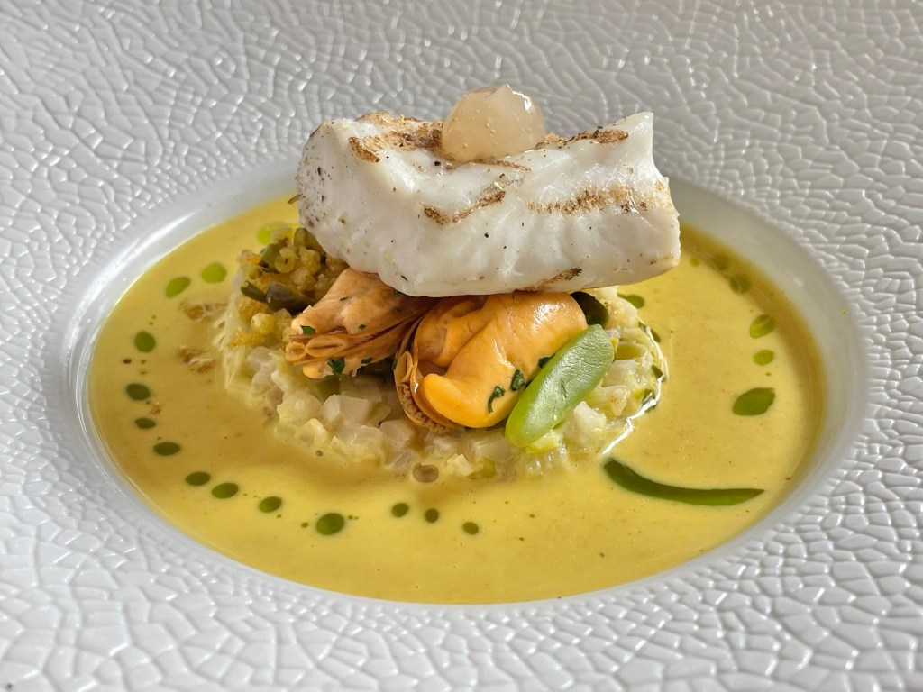 Next was the best dish: perfectly cooked plaice with leeks, lime jelly, and Mouclade, which is mussels with a creamy saffron sauce from Charente-Maritime in France. This paired very nicely with the 1959 Riesling Auslese, as well as with the 1982 Gewurz.