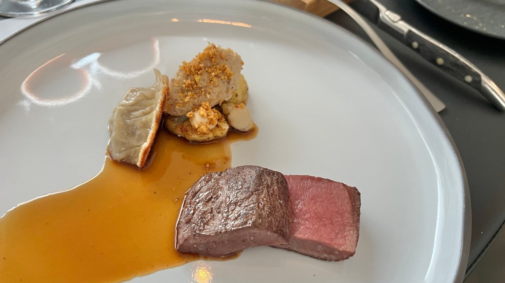 The main course was backstrap of roe deer venison with a gyoza stuffed with meat from the shoulder of the roe deer, cauliflower, and jackfruit. According to the menu there are cassis berries and oil from the branch of the cassis, but that didn’t stand out for me. The venison was perfectly tender and medium rare.