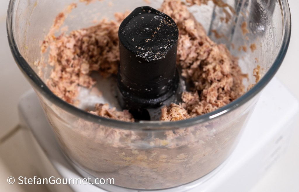 Pulse until the filling has a homogeneous consistency. It should be slightly coarse, not a smooth puree. This is why it is better to use the pulse. Scrape down the sides of the bowl with a spatula as necessary. Taste and adjust the seasoning with salt and freshly ground black pepper, remembering that the filling when you taste it by itself should be seasoned a bit more strongly than you think it should be.