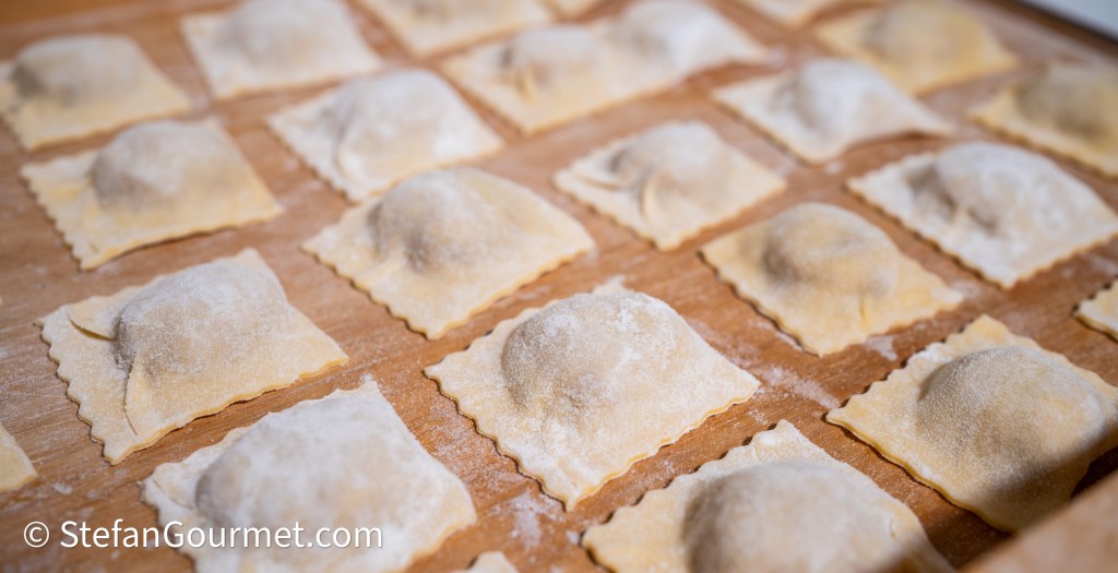 When the dough and filling have both rested sufficiently, roll out the pasta dough thinly, and make ravioli according to my instructions.