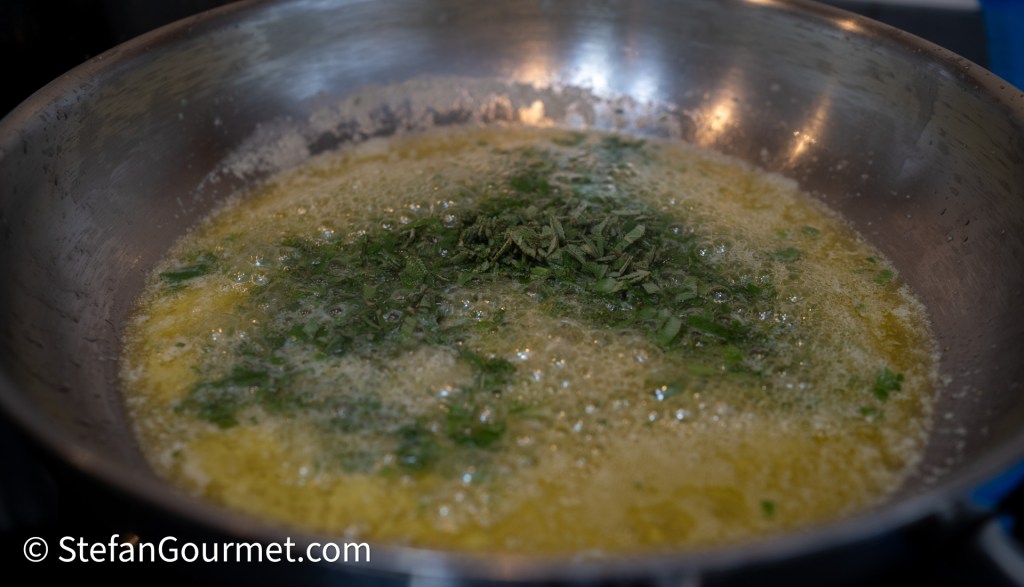 To serve the dish, bring a large pot of water to a boil. In the mean time, mince fresh sage leaves to obtain about 4 tablespoons (1/4 cup). Melt 100 grams of butter in a wide frying pan over medium heat, preferably one with curved sides as that will make it easier to toss the ravioli later. When the butter has melted, add the sage, and stir. Cook until the sage is starting to crisp up and the butter is starting to turn golden brown. Turn off the heat.