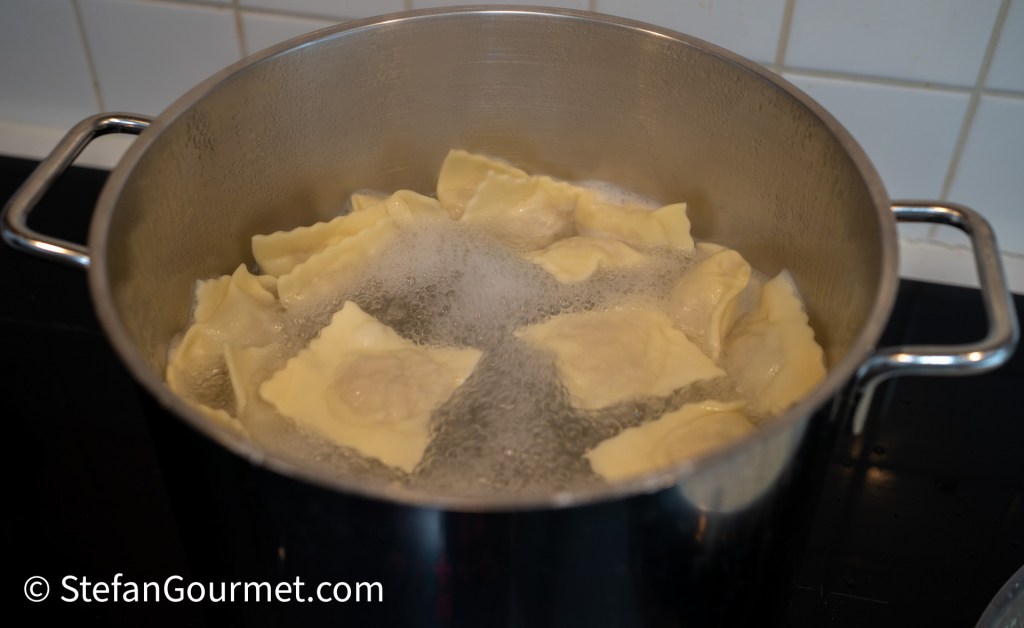 The dish can be prepared in advance up to this point. Refrigerate the ravioli in case of a high ambient temperature or if you are going to cook them more than a couple of hours later.