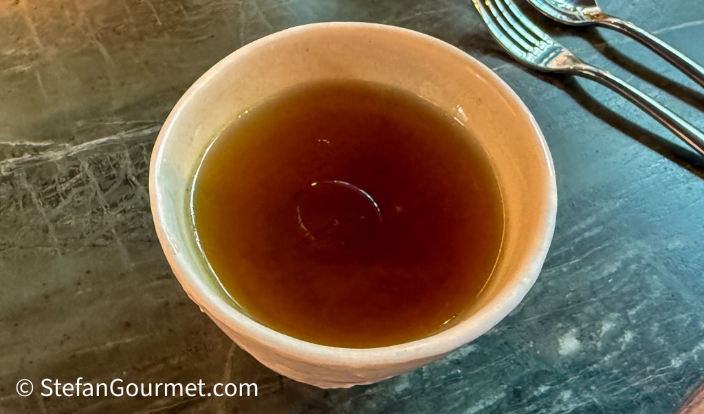 The first course is a fragrant coral trout bone noodle soup. The noodles in the soup are made from the bones of the coral trout, which have been processed in a kind of flour. The stock has a very nice full flavor.