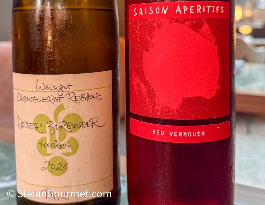 The pairing starts with a Pinot Blanc (Weisser Burgunder) from Pfalz, Germany, and a red vermouth produced in Melbourne.
