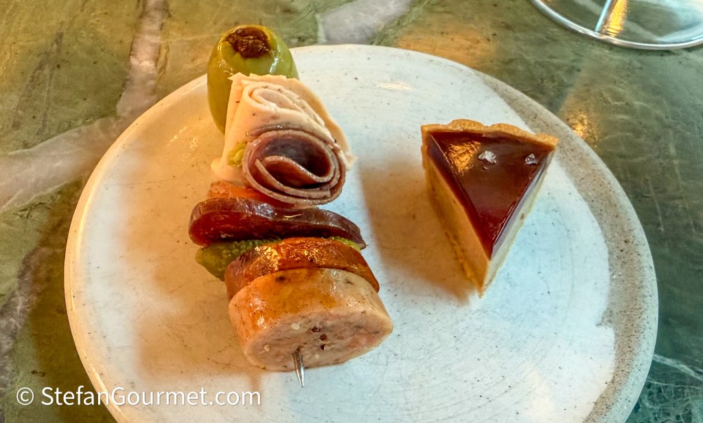 The second course is seven different types of fish charcuterie as well as a John Dory liver paté tart. The charcuterie includes fish chorizo and fish mortadella, and it is all delicious and pairs very well with the Pinot Blanc. The liver paté tart pairs very well with the vermouth.