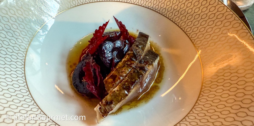 This was an excellent pairing for the blue mackerel with olive brine and extra virgin olive oil, sourdough bread, and cultured butter. The blue mackerel was served raw and impeccably fresh. We were instructed to first dip the bread in the dressing and then to eat it with the fish and the butter. Delicious.