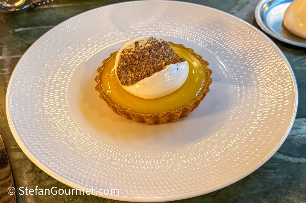 The dessert was a meyer lemon meringue tart. The meringue was scorched at the table by kissing it with a hot piece of charcoal. The sake with yuzu was a bit strong for the dessert.