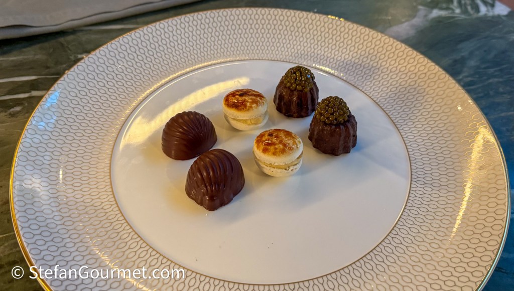 The meal ended with “Sweets of the Sea”: canelé with caviar, a macaron with fish eye crème brûlée, and smoked chocolate with fish bones and fat. Delicious and very original.