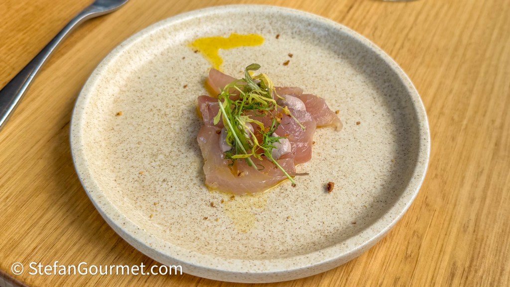 The second course was raw kingfish with walnut, cumin, and marigold. The combination of walnut and cumin with the kingfish was delicious and the kingfish impeccably fresh. This was paired well with a 2022 Match Point Rosé from Rylestone, New South Wales, Australia, blend of Cabernet Sauvignon and Merlot. The wine was very elegant, but the texture worked well with the nuts.