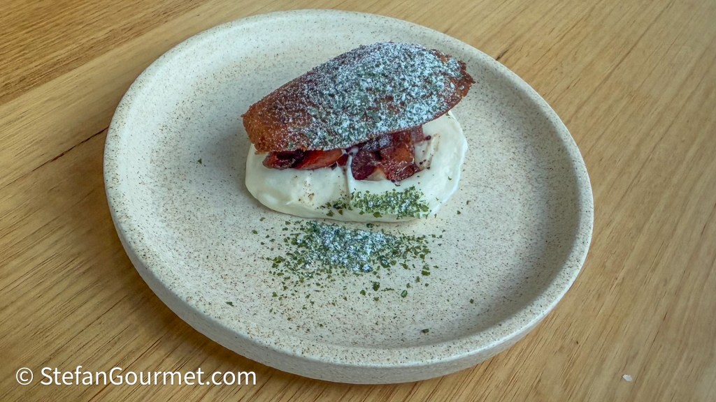 The final savory course was pink ling (some kind of white fleshy fish) with a sea lettuce curry, deep fried samphire, and crème fraîche with herbs. The fish had a very nice sear but was still juicy and worked very well with the other components on the plate. It was paired with an excellent 2022 Merrill Chardonnay from a winery very close to the restaurant, Tambo Winery. I would have liked a full glass with this wine with the dish.